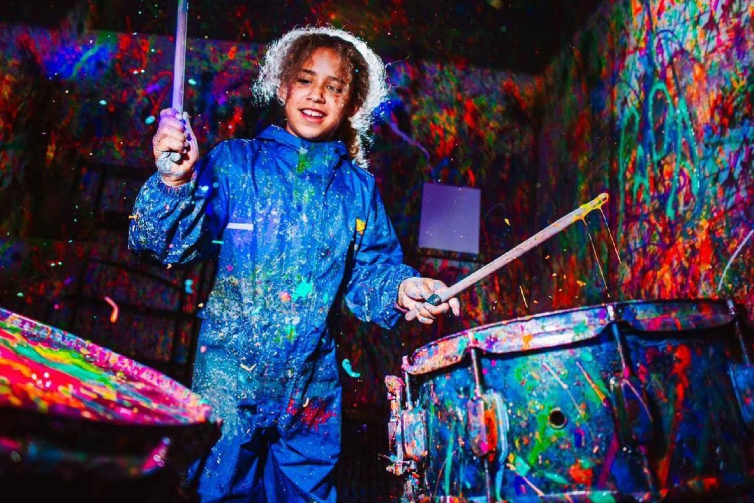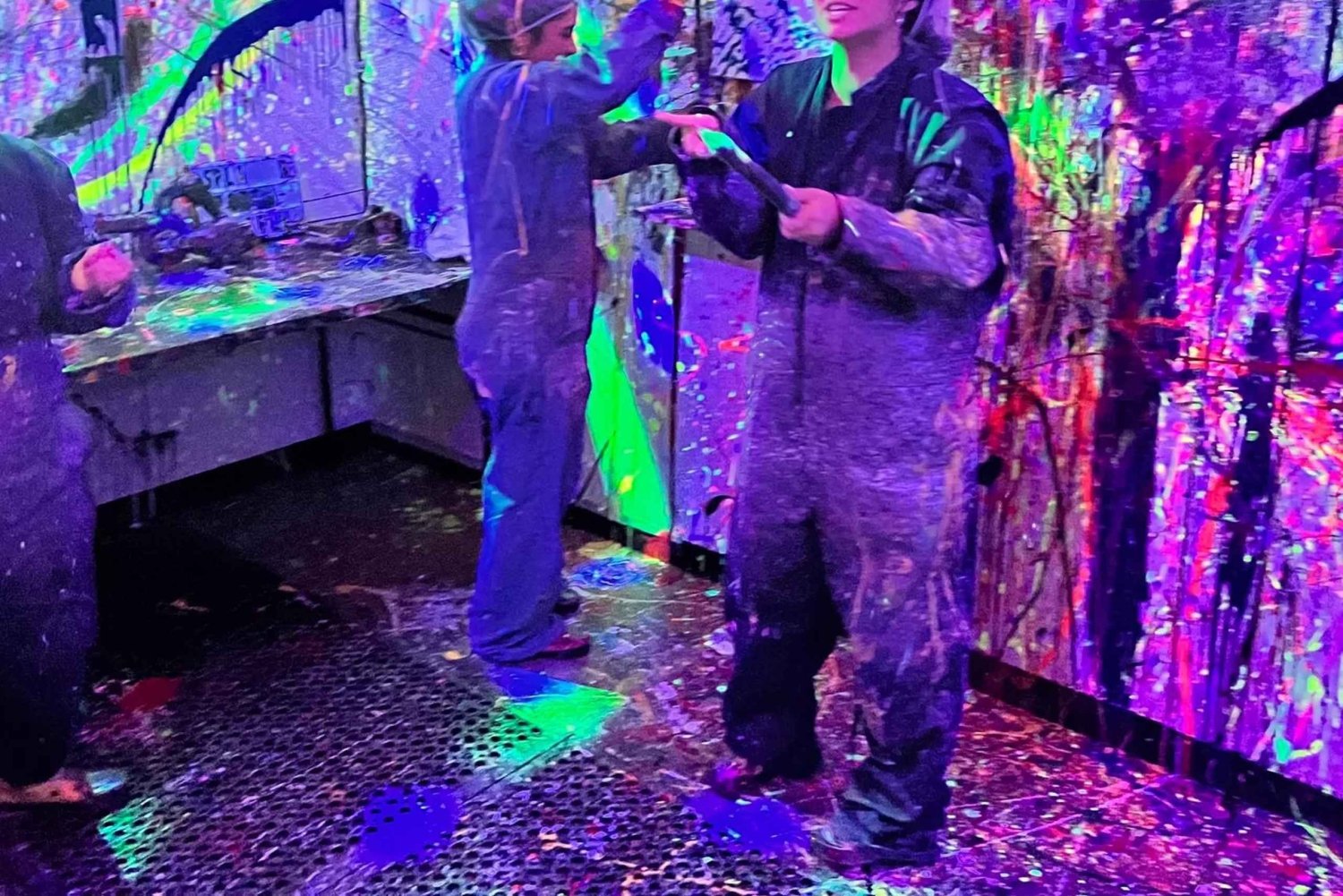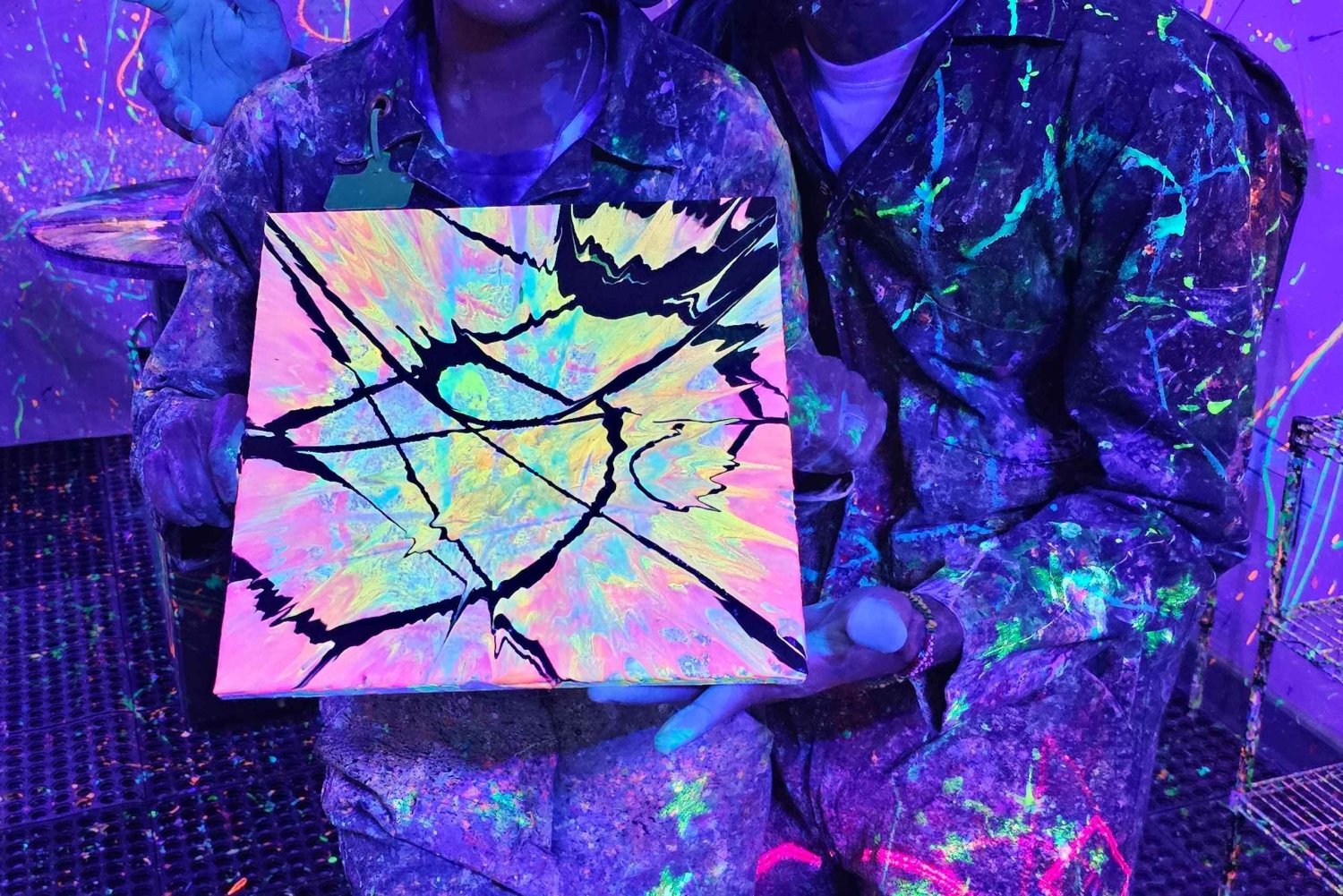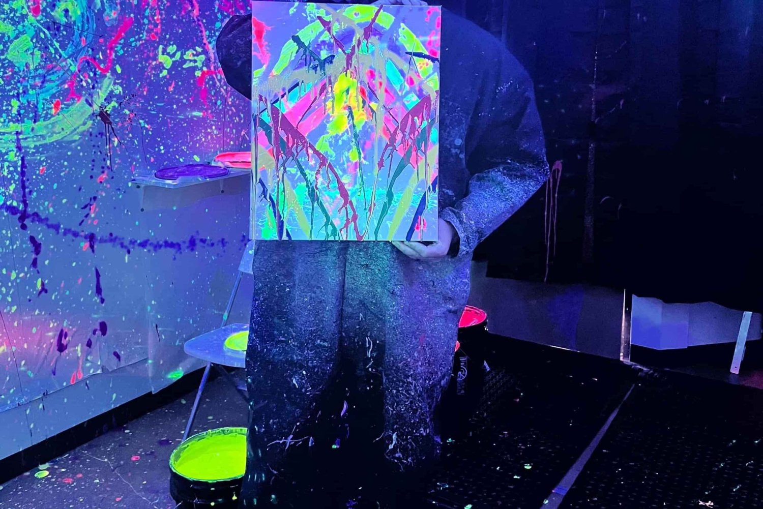 - Unleash your creativity in a neon-lit splatter room with vibrant paints